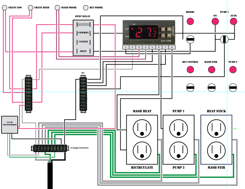 The panel will have two temperature control units built into it. The first will control the temperature of the wort in our mash tun. Typically we try to keep things in the MLT around 153 for about an hour. Currently, we do this by pumping in hotter than 153 water, adding our grain, and then recirculating it through a heat exchanger as necessary to maintain heat. This has worked, but by only recirculating to heat things up, there are lots of time where the wort just sits in there, and the temperatures can become inconsistent throughout.