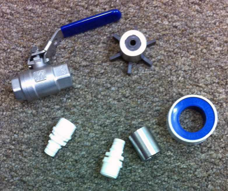 One new stainless steel ball valve. One 1/2″ stainless steel coupler. Two quick disconnect fittings. A roll of teflon tape. And a new brew pump impeller.