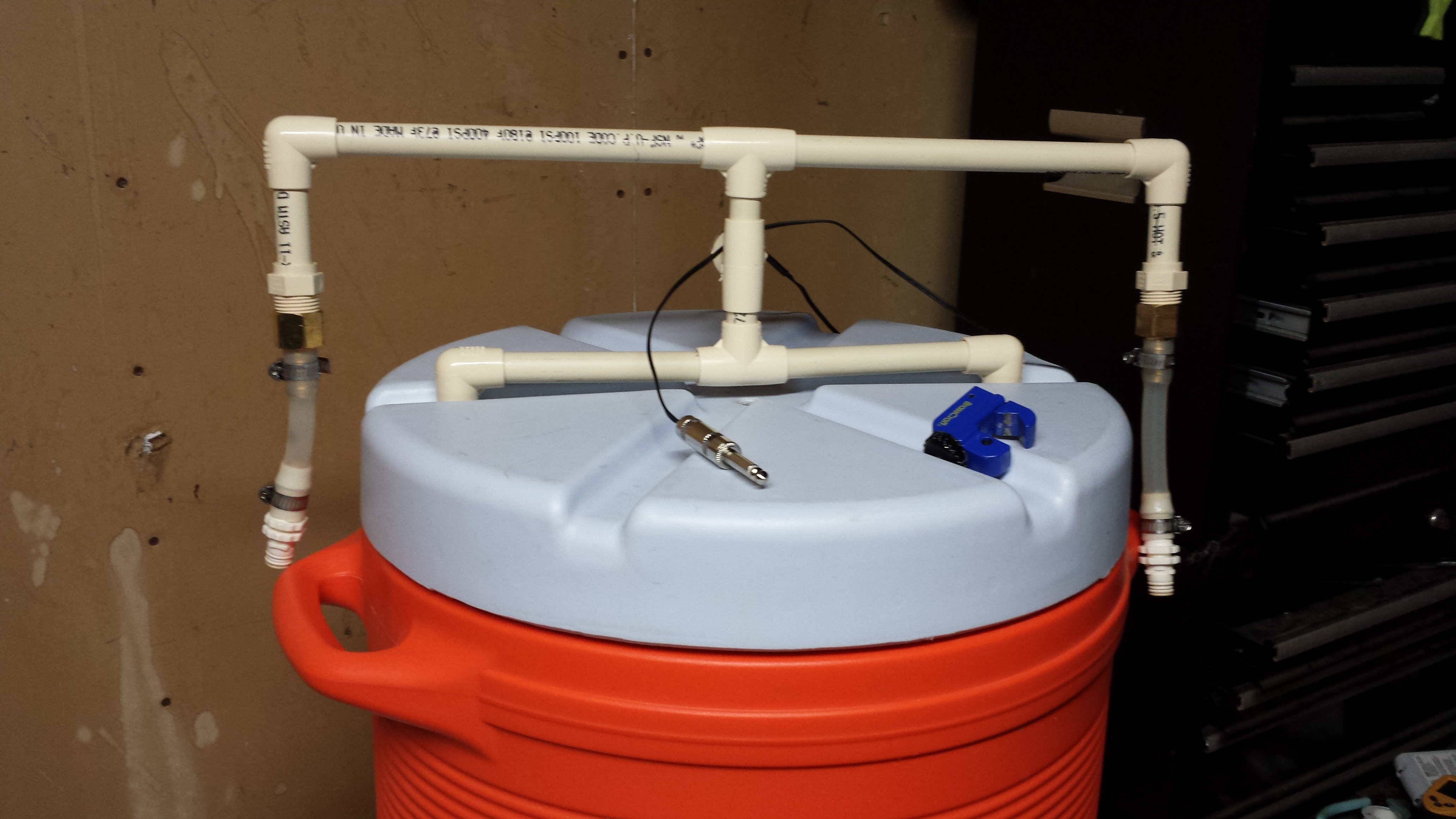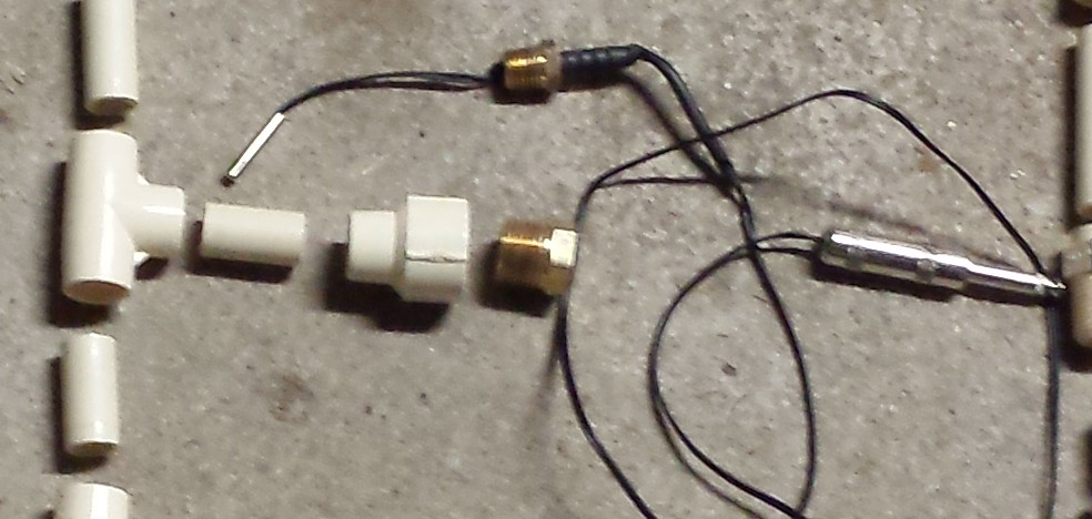 Our temperature probe goes inside the manifold and will send instant readings to our control module. To prevent hot wort from leaking out of the probe port, we ran the wire through a 1/4″ NPT fitting with a 1/4″ barb and then shrink wrapped it all together so it is a nice tight fit. That 1/4″ fitting connects to a 1/4″ to 1/2″ bushing, which then attaches to the cpvc t via an adapter. The temperature controller (sorry no pic to show you) will then control whether wort flows via a simple recirculation through the TIM or whether it first passes through a heat exchanger in the hot liquor tank.