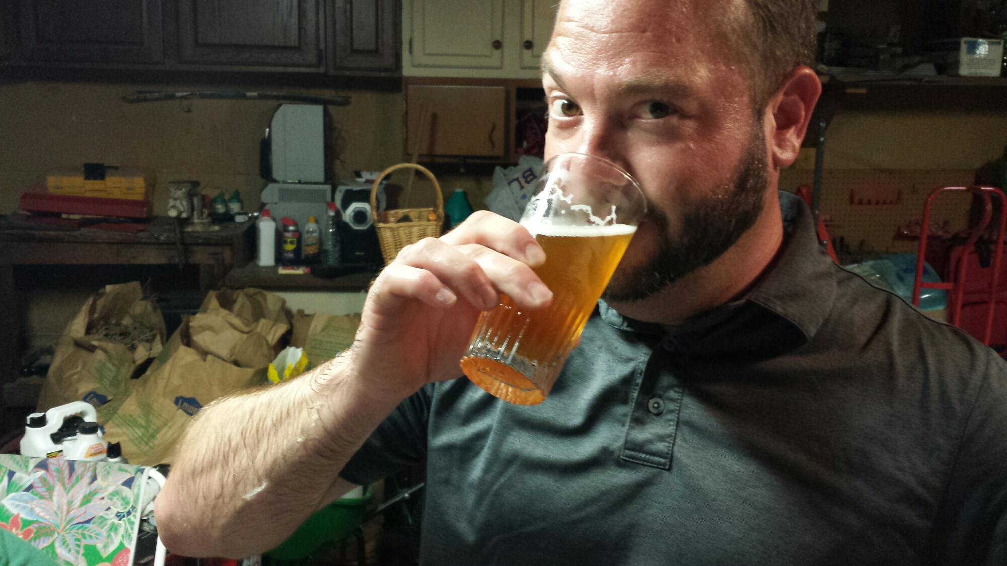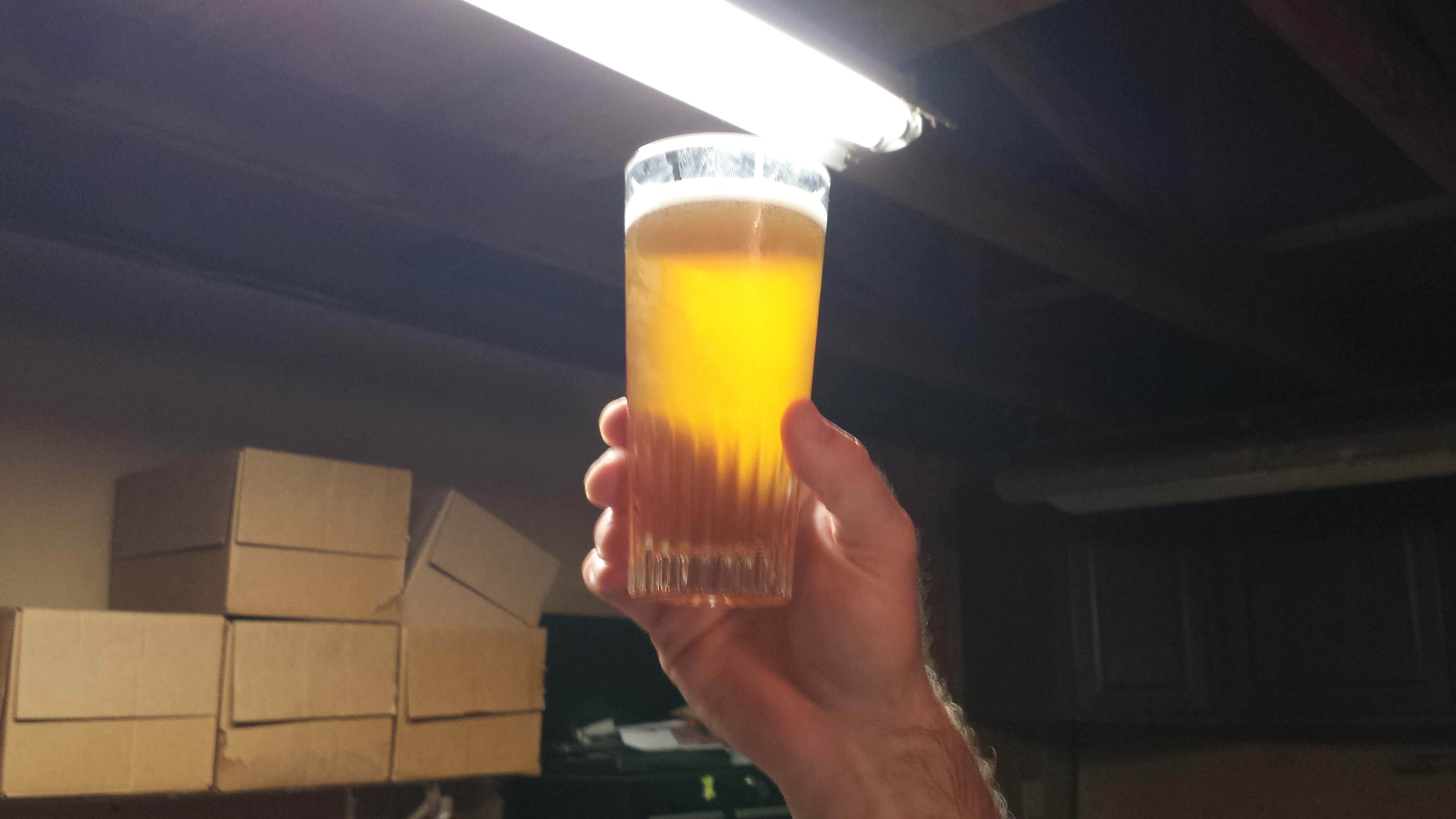We know this isn’t a “proper” glass for a blonde ale, but we aren’t picky. This is hand model extraordinaire Brian showing off the color and clarity of our brew. She’s a pretty beer!