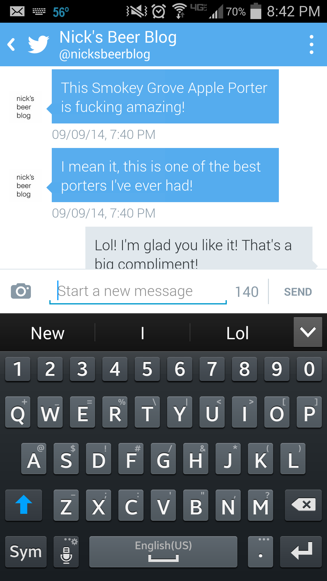 Now Nick kept us waiting a bit longer, but we just so happened to send our beer to him when he had five other beers to review. Sucks to be him right? So I did get an idea of how his review was going to go when he sent me a direct message on Twitter last Tuesday that went a little something like this.