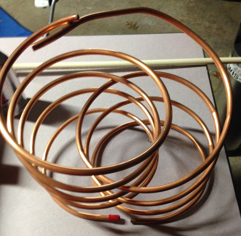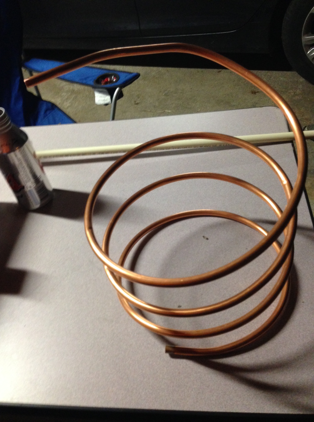 We started off with a single 25 foot roll of 3/8″ copper tubing. We cut it in half, and bent the two lengths around a corny keg to create two helixes. 12.5 feet of tubing may not sound like much, but we don’t need a massive temperature shift. We aren’t cooling boiling wort down to pitching temps…just warming it up a bit. If my math, and understanding of the heat transfer capacity of copper is correct, we should be fine. If not…more can always be added. This is just a prototype after all.