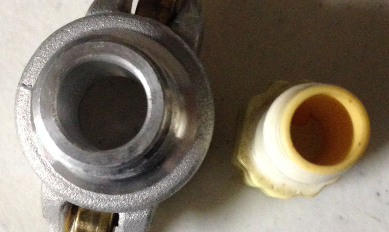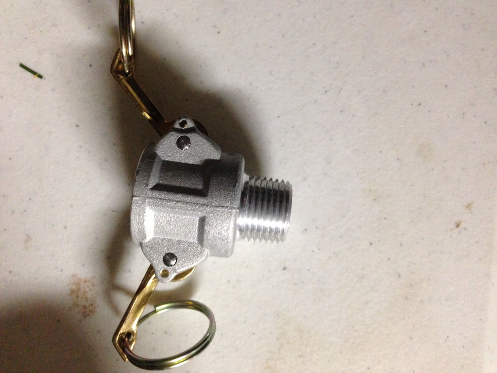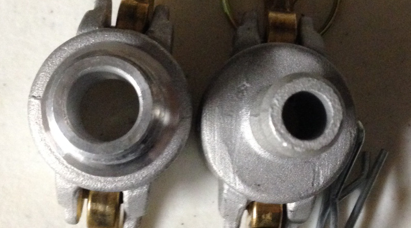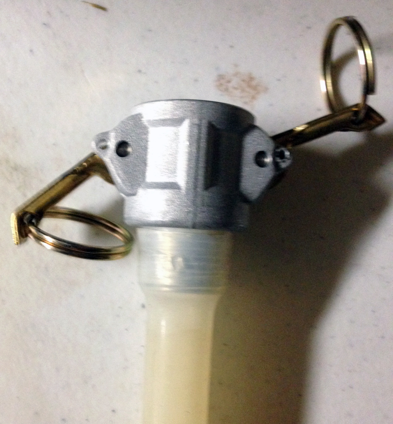 On the left is one of our new 1/2″ cam and groove fittings. On the right, one of our old Kent twist fittings. You can see the difference in diameter. Flow should no longer be an issue with these…unless you get the ones with a barbed hose connection. You can see such a camlock on the right in the pic below. As you can see, it too (despite being a 1/2″ disconnect…only has a 3/8″ orifice.