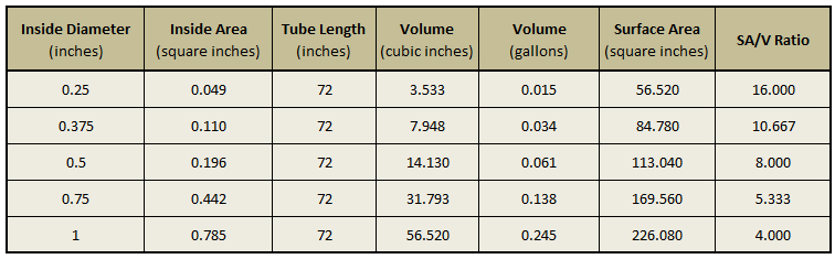 Let me illustrate. Below is a handy chart that I made in excel to demonstrate the flow capacity of some of the most common pipe and tubing sizes used in home and small scale brewing. If you look at the Volume columns, you will clearly see that by using fittings with a 3/8″ opening (the .375 row for those who aren’t as quick as I with fraction to decimal conversions), we were essentially cutting our flow in half.