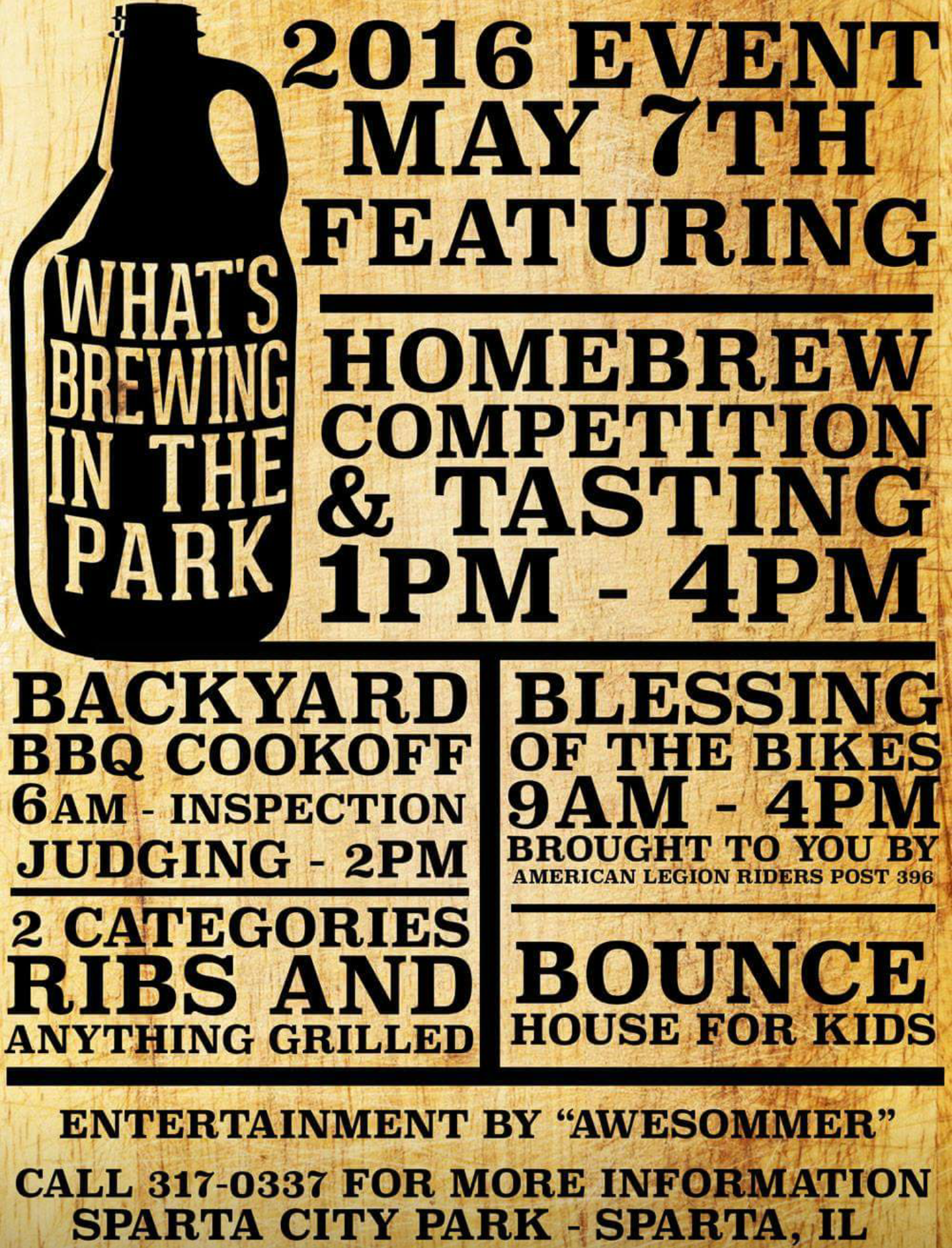 Well, that’s all the pictures I have, but let’s talk about the Sparta competition. This year we are participating in the “What’s Brewing in the Park” competition in Sparta, IL. Here’s the flyer.