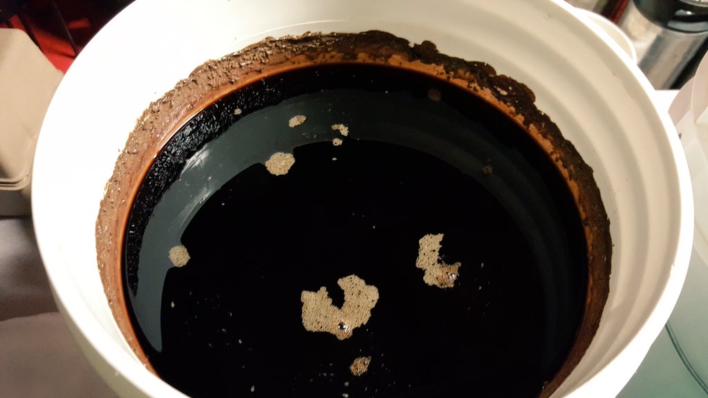 We pop the top off the fermentation bucket to find our Chocolate Milk Stout. Primary fermentation complete, we pulled a sample and tested it and of course tasted it!