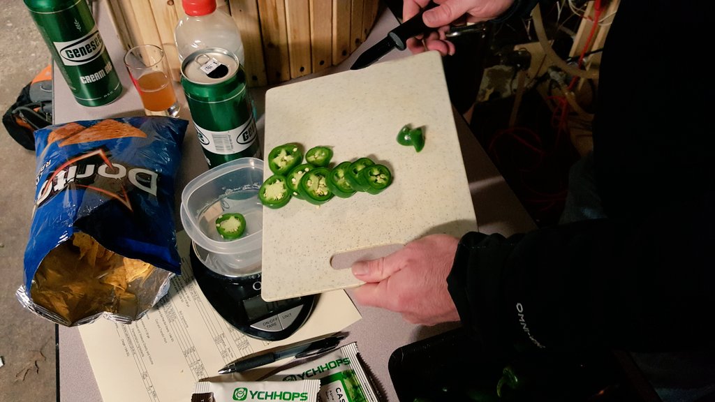 Brian slicing the jalapeños, getting ready to add them to the boil. Yeah we drink Genny Cream Ale and eat Dorritos while we brew, what of it?