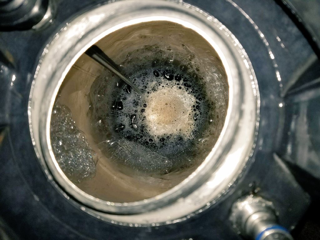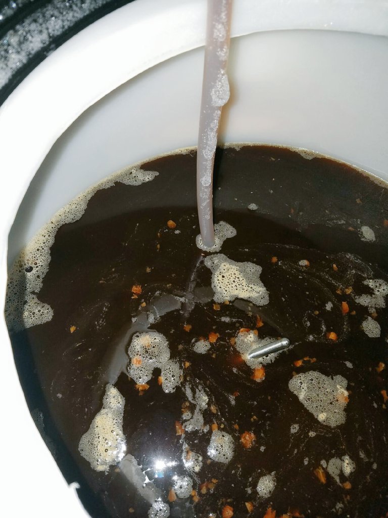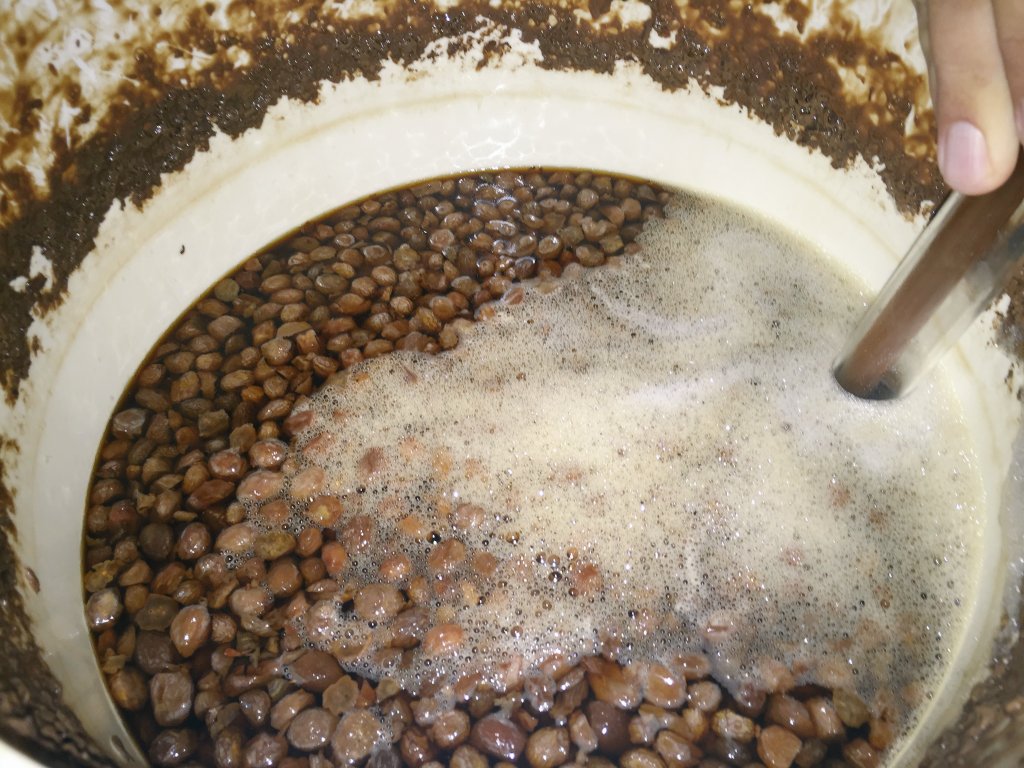 Inside the fermentation buckets. The raisins are all plump and full of beer!