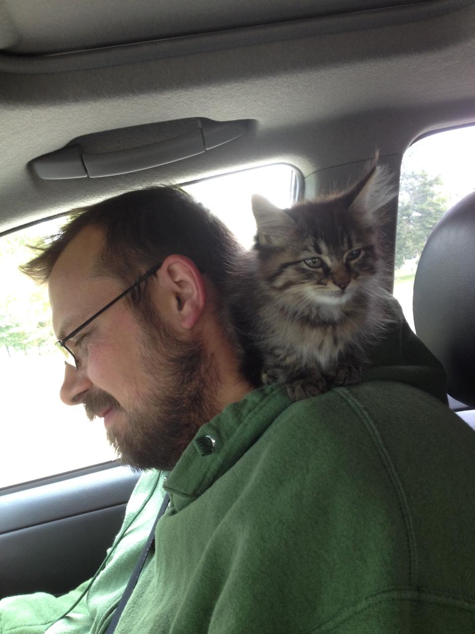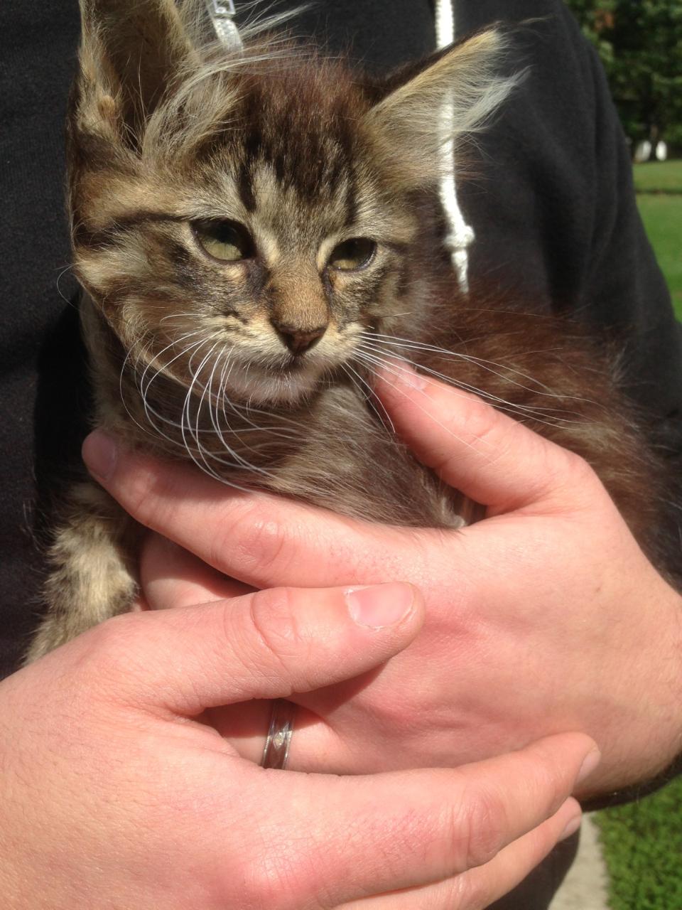 We found this kitten crying in the woods while we were disc golfing. She was a sweet little thing. After a while of holding her and passing her around to toss our shots she jumped down. We thought she was going to run away,  but she followed us through seven holes of disc golf. When we stopped to throw, she stopped and waited. So damn cute. She needed food and water desperately so we took her to a no kill shelter near by to get cleaned up and checked out. The ladies were gushing over her and swore she would be adopted really quick.